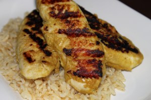 I love Thai food, thus I LOVE just about anything with curry. The main problem with curry dishes is that they usually have a good amount of fat from coconut milk. This recipe is a simple, yet tasty way to avoid the fat while still getting that spicy flavor! It’s genius, I tell you. This dish is SUPER easy to prepare in that all you have to do is mix yogurt and your favorite curry paste togeter, coat your chicken in it, let it hang out for a mere 20 minutes, and then grill. You can either use this as a main course or thread the chicken on skewers and serve it as an appetizer. Either way . . . DELICIOUS, FLAVORFUL, & MOIST!