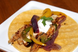 Separate the onions into rings and place them in a medium bowl. Slice the bell peppers lengthwise into ¼-inch strips and add them to the bowl with the onions. Add 2 tablespoons of the reserved unused marinade and toss well to combine. Slice the chicken into ¼-inch strips and toss with the remaining 2 tablespoons of reserved marinade in another bowl. Arrange the chicken and vegetables on a large platter with the warmed tortillas and serve.