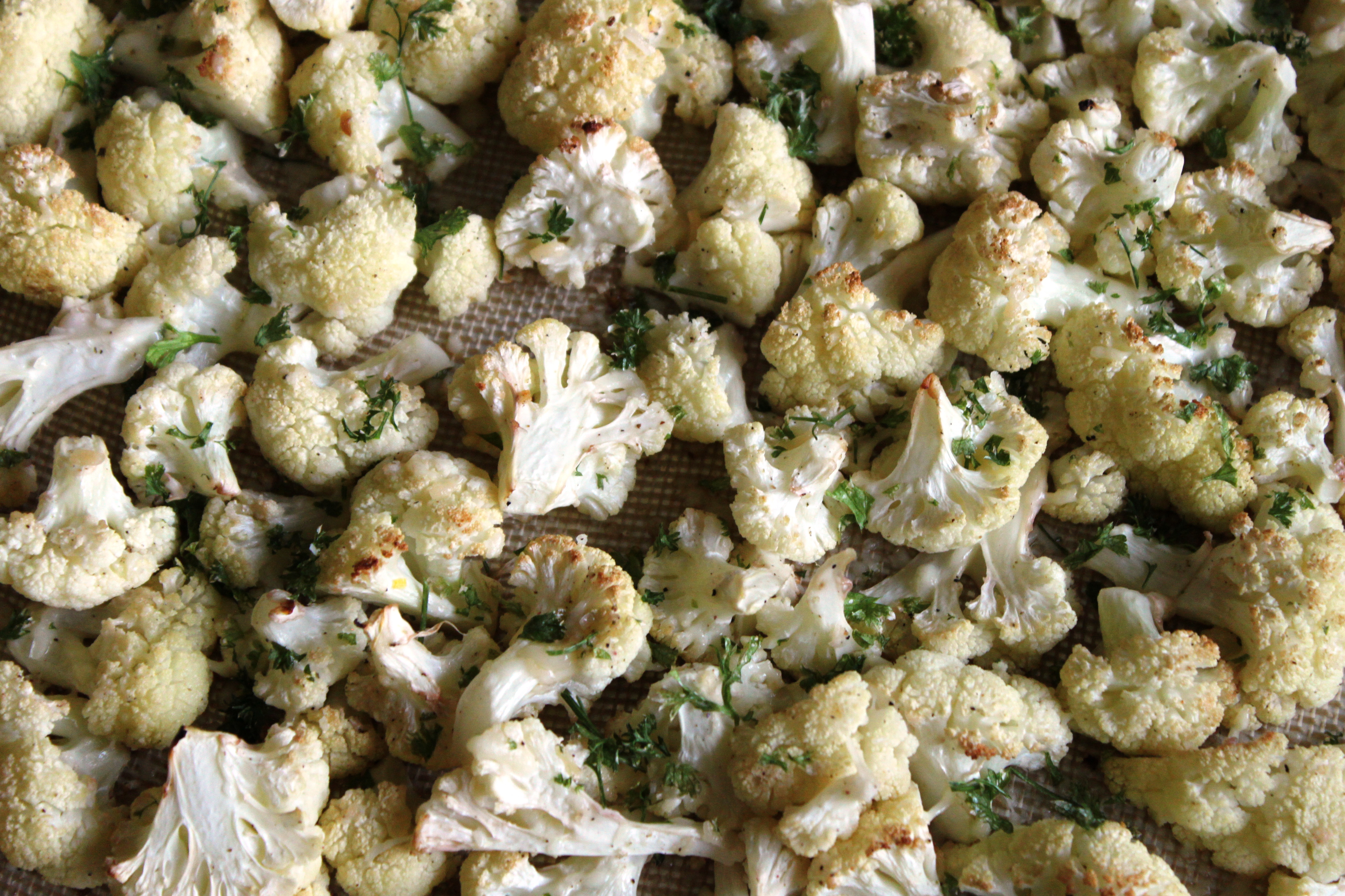 Place cauliflower in a large bowl. Combine olive oil, lemon juice, and garlic in a separate bowl. Pour wet mixture over cauliflower and toss to coat well. Pour into the prepared baking sheet. Bake for 25 minutes, stirring halfway through. Top with parmesan cheese and parsley and broil for 3 minutes. (I usually don’t broil, but just stick it back in the oven for a few minutes longer)