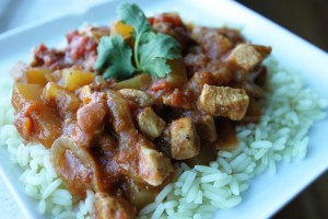 Season chicken pieces with salt and pepper. Heat oil, curry powder, and paprika in a large skillet or saucepan over medium-low heat for two minutes, until fragrant (but don’t let it burn). Turn the heat up to medium and stir in onions and garlic and cook 7-9 minutes more or until onions are very clear. Add chicken, tossing lightly to coat with curry oil and cook for 7 to 10 minutes, or until chicken is no longer pink and is cooked through or nearly cooked through (it will continue to simmer in the next step). Add potatoes, coconut milk, tomatoes (I lightly crushed the stewed tomatoes with my fingers before adding), tomato sauce, and sugar into the pan, and stir to combine. Cover and simmer, stirring occasionally, for about 30-40 minutes. The sauce thickens slightly upon standing, but is great served piping hot (and a bit thinner), too. Serve with brown rice (or your favorite rice if allowed) and garnish with cilantro, if desired.