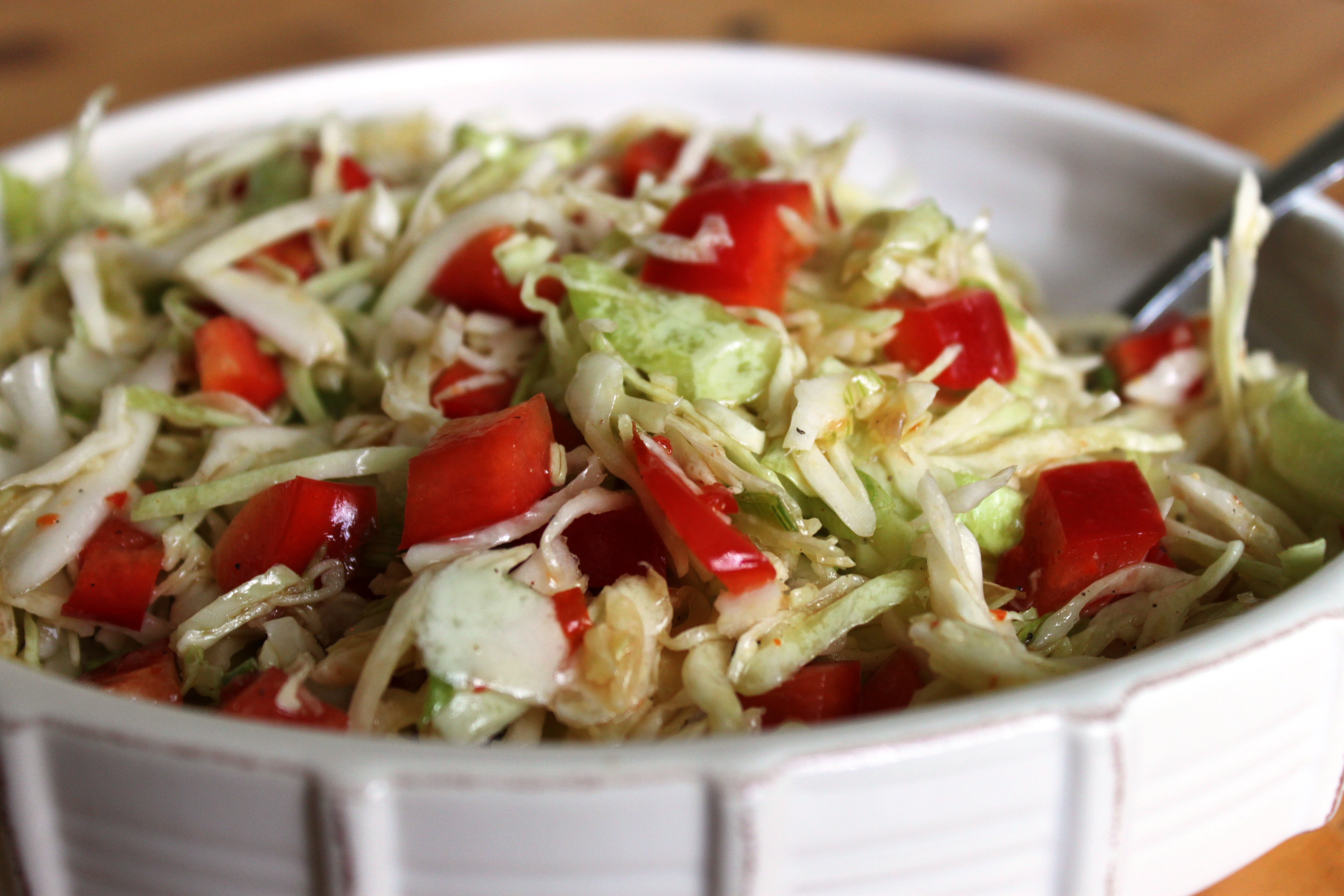 Here’s a flavorful way to get those veggies in! I love making cabbage salads because they are low in calories and usually packed with flavor. This salad is no exception. This kind of reminds me of a common salad I see at pot-luck socials that has Top Ramen noodles in it. If you’ve had that before, then you’ll know what to compare this to. The main difference with this version is that I’ve left out those processed, calorie-induced noodles, and used fresh ingredients for the dressing. Thus, I think this version of the salad tastes fresher. Also, If you don’t have sweet red Thai chili sauce (which is found in the Asian section of most grocery stores) you can substitute low-sodium soy sauce instead and have good results.