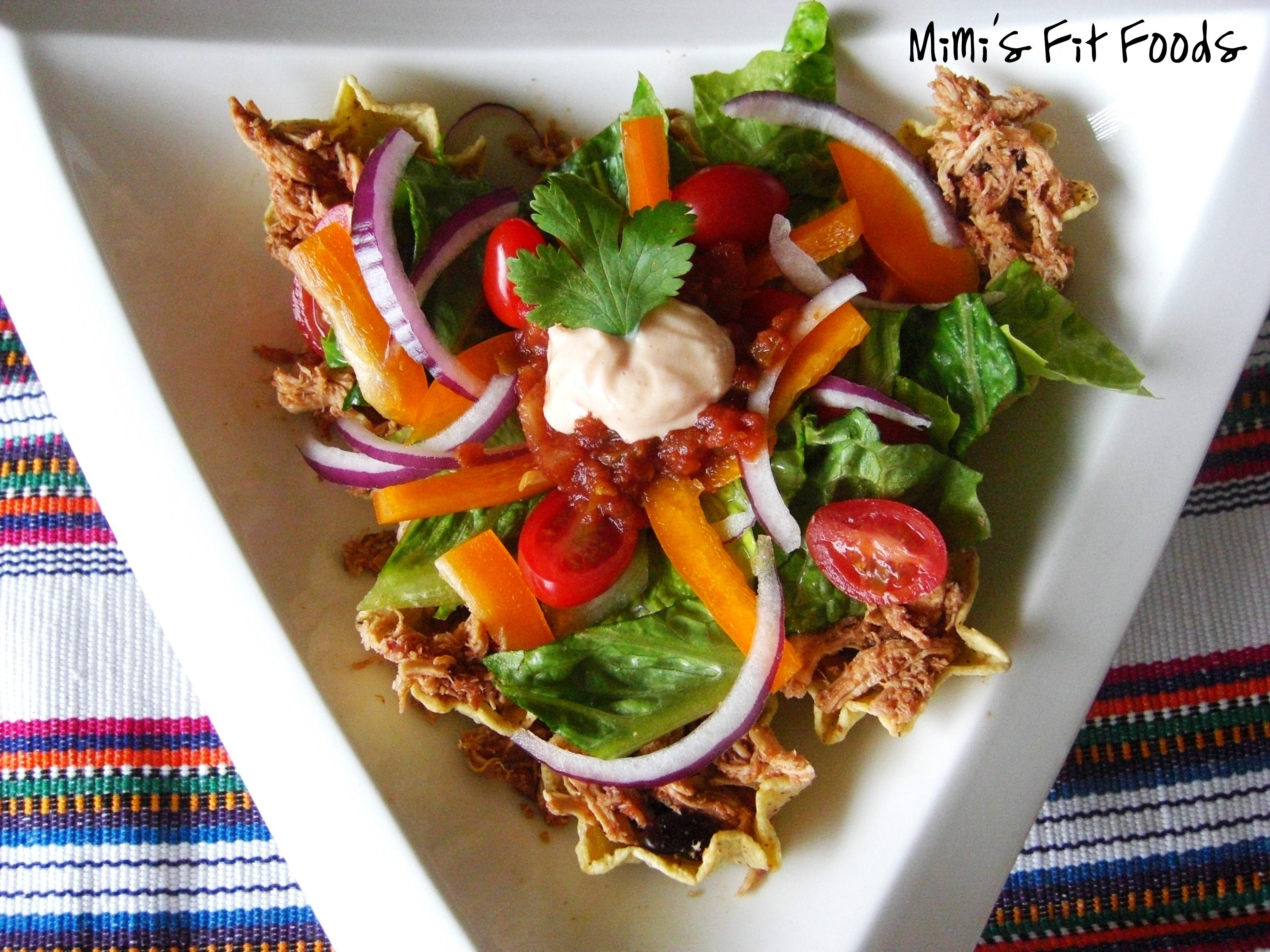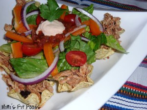 Place tortilla chips on an individual plate. Top with Salsa Chicken, lettuce, red onion, tomatoes, bell peppers, salsa and Fit Ranch Dip.