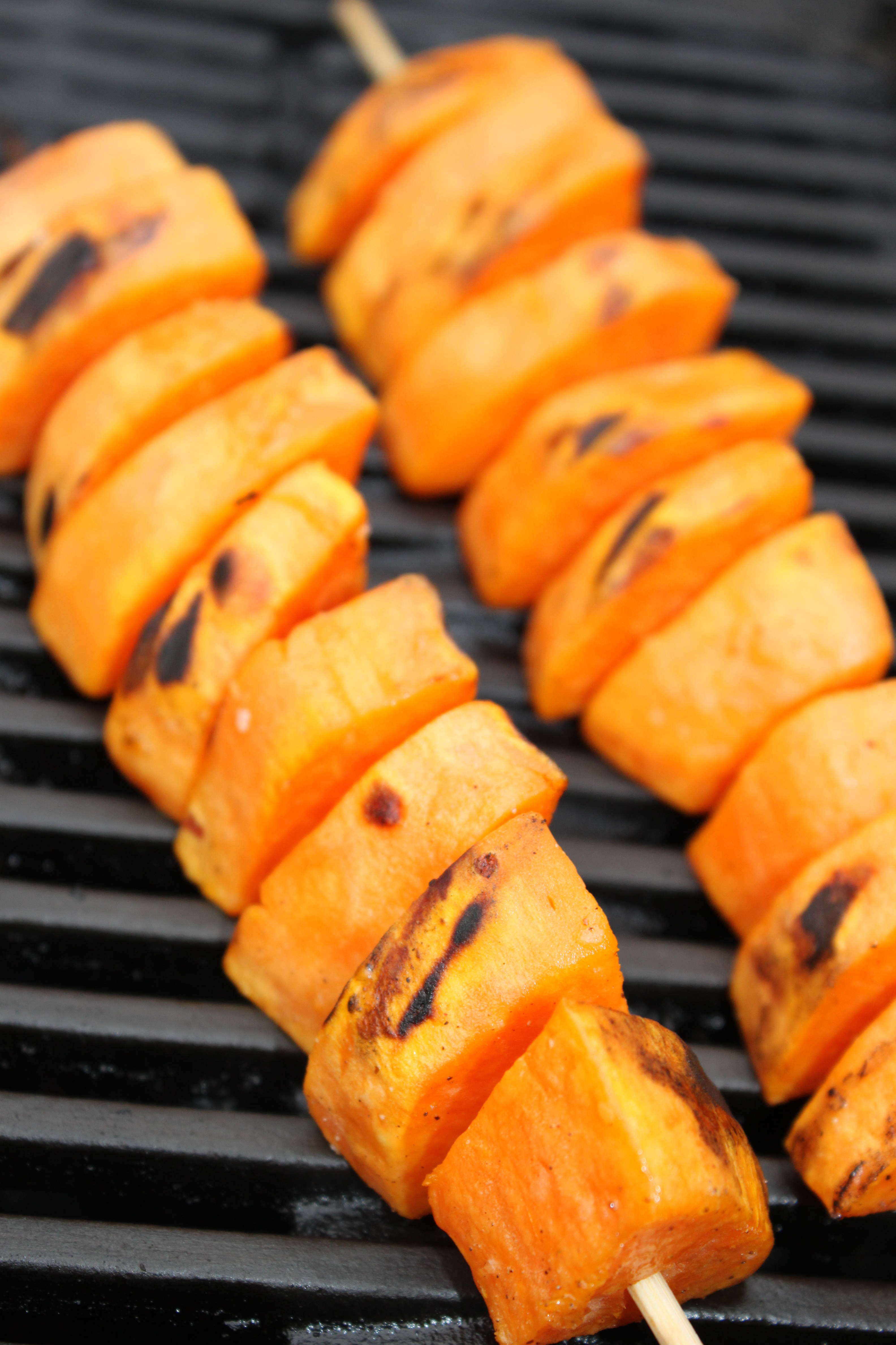 Preheat a charcoal or gas grill to medium or medium-high heat. Grill the sweet potato skewers, flipping every 5-6 minutes, for a total of about 15-20 minutes, until the sweet potatoes are tender.