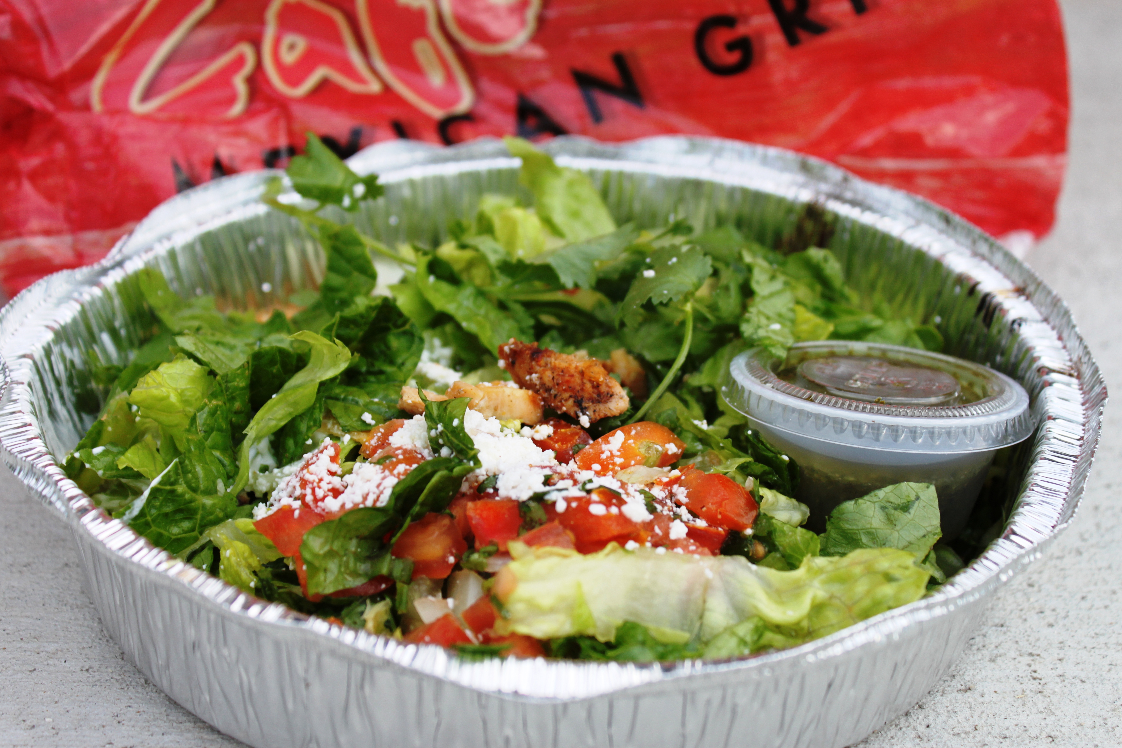 Instead of ordering a full salad, you’re going to order a Grilled Chicken Tostada Salad with a soft shell tortilla (order wheat if they have wheat ones…most locations do) and no cheese. You will need to choose rice or black beans as we don’t need multiple complex carbohydrates in one meal, so you get to choose one. If interested, black beans will be a more nutritious choice. Now, veggies are “free” (so-to-speak) so load up on the lettuce and the pico (I often times ask for an extra scoop of pico de gallo). As you wrap up your salad order you’ll want to ensure you don’t get the sour cream or the tortilla strips. Order the vinaigrette dressing (cilantro-lime dressing = YUM) and NOT the creamy tomatillo dressing. They usually put the dressing on the side for you, so you shouldn’t have to ask them to do that. And, when you actually go to eat your salad, you should only need about half of it (the dressing, that is!).