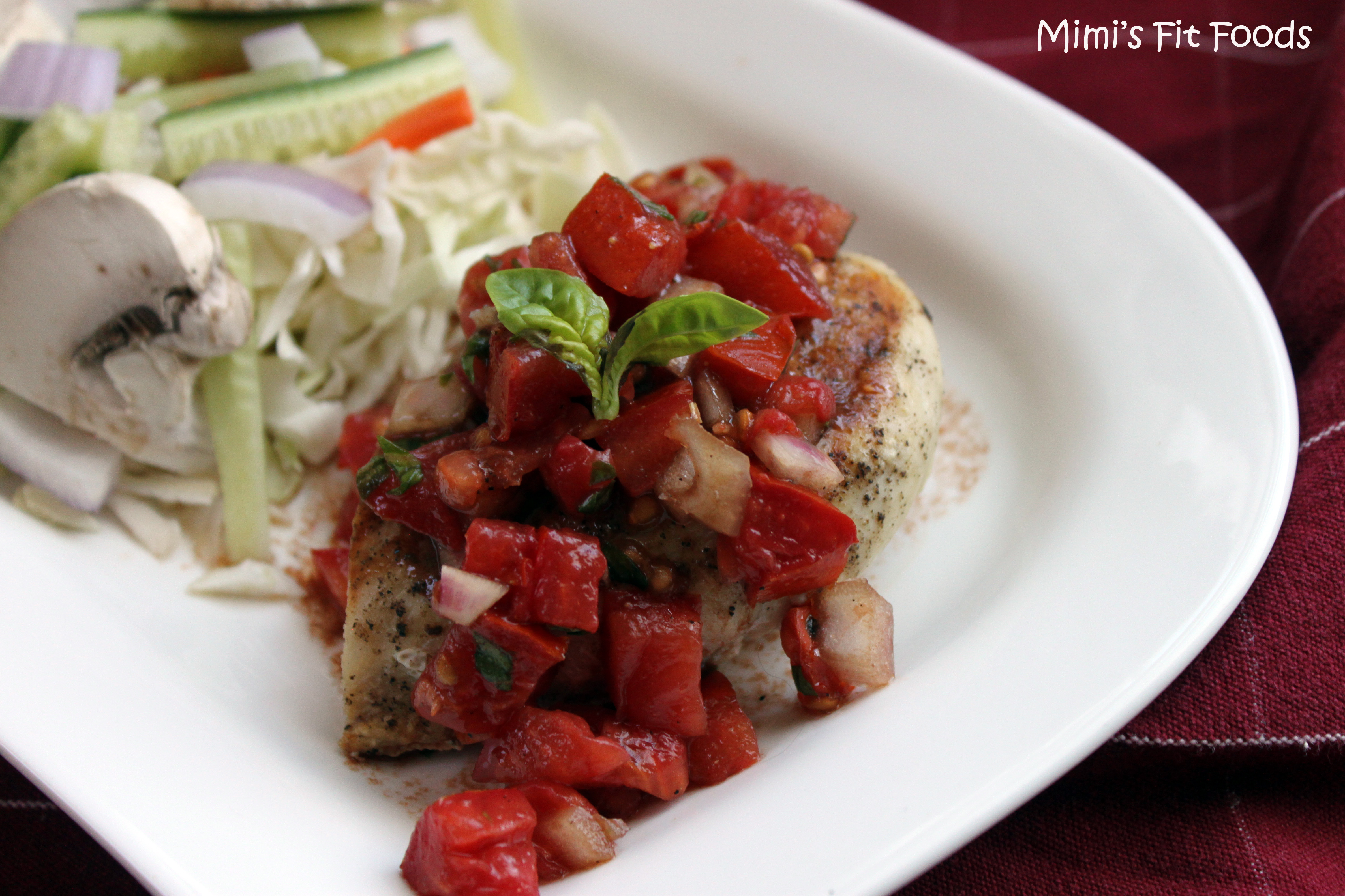 This is a great way to use Bruschetta! The fresh tomatoes, basil, onion, and vinegar help make this grilled chicken far from bland! It was simple to throw together too!