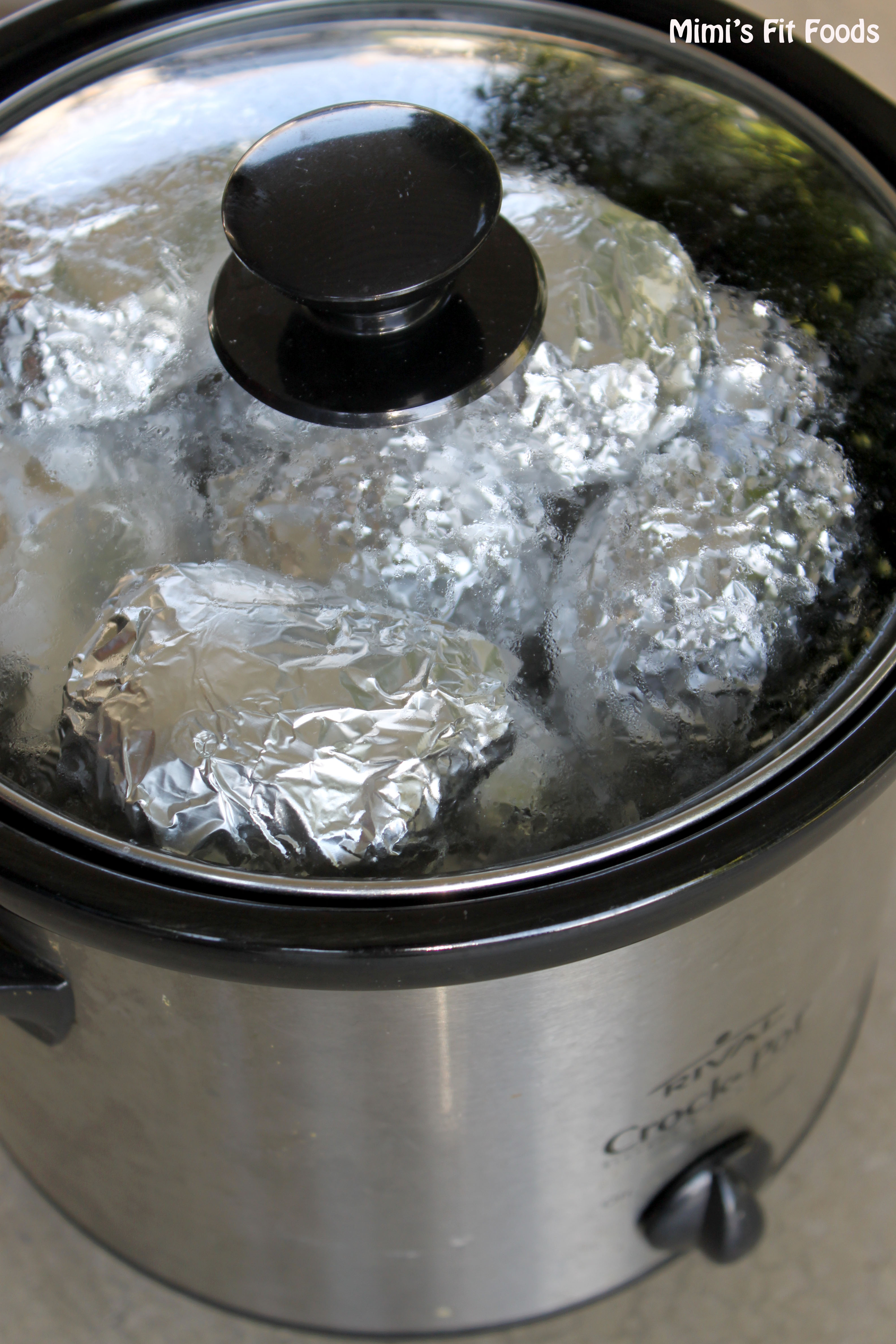 Place the foil wrapped potatoes in your slow cooker.  I put 10 medium sized potatoes in my 4 quart crock pot.