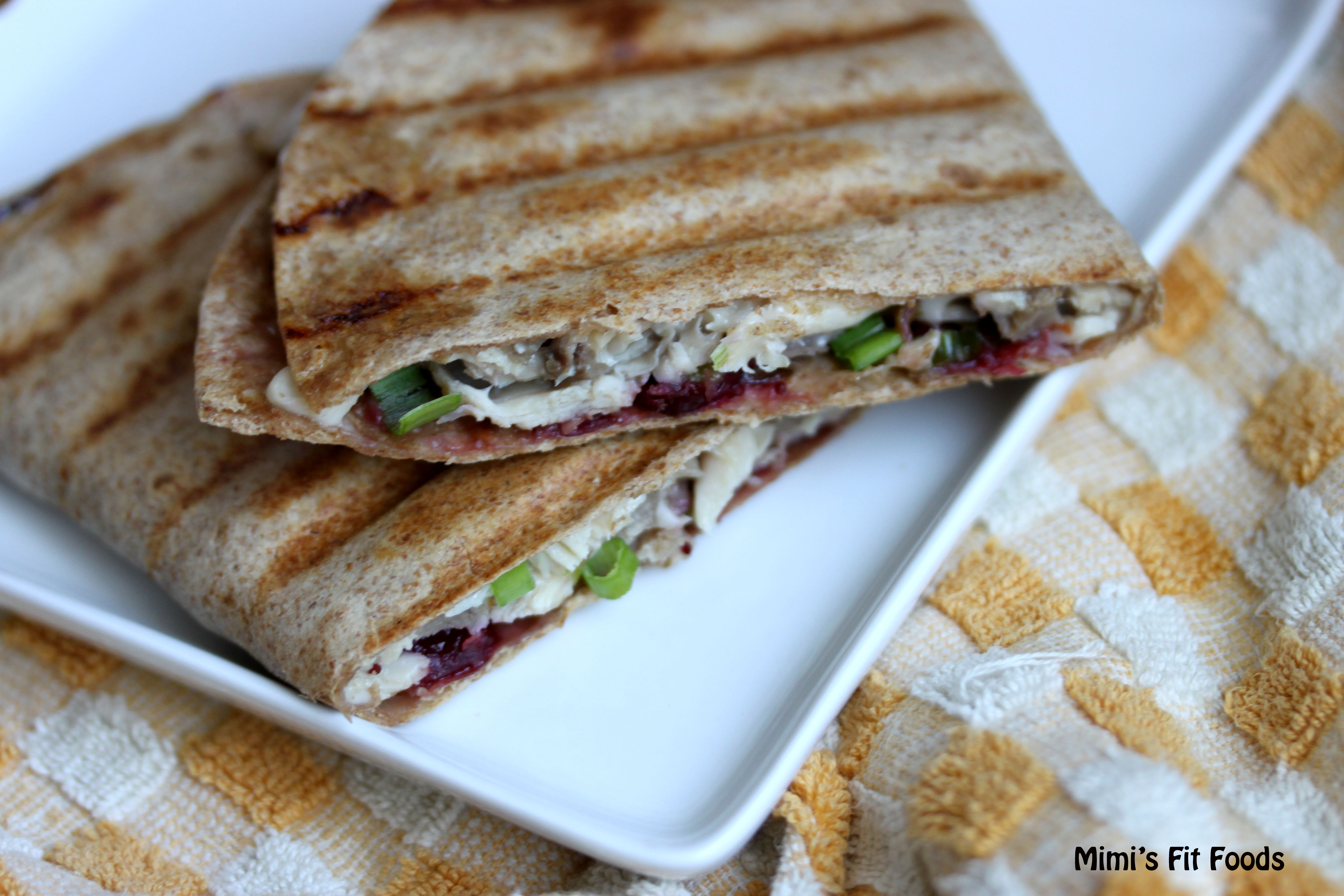 Lightly coat a large skillet with cooking spray and place over medium heat. (See tip below for optional cooking directions which I actually prefer.) Place a tortilla in the skillet and over half of the tortilla sprinkle 1 slice of the chopped light Swiss cheese, half the leftover turkey, and green onions. Spread 1 tablespoons cranberry sauce on the other half of the tortilla. Fold tortilla over the filling and cook until lightly browned, about 3 minutes. Turn and brown the other side. Remove from skillet and set aside for about 1 minute. Cut quesadilla into wedges and serve. Repeat with the second tortilla and remaining ingredients.